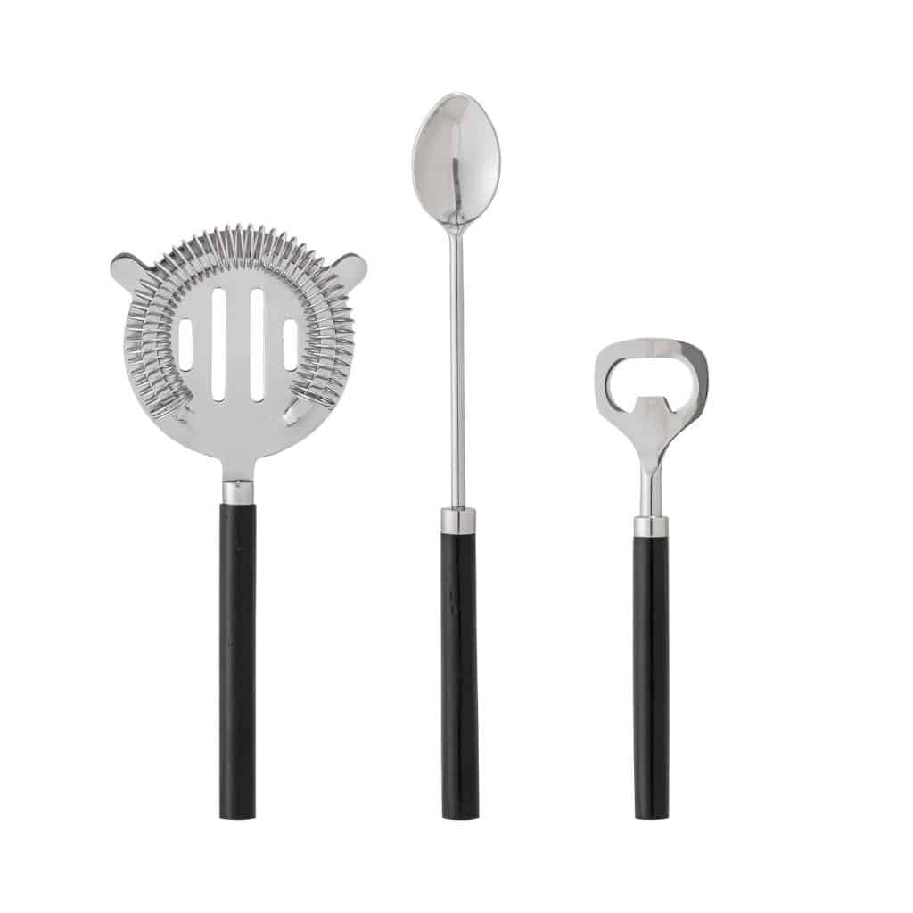 Barset från danska varumärket Bloomingville. I en förpackning finns 3 redskap, alla tillverkade i rostfritt stål samt handtag i svartmålad mangoträ.