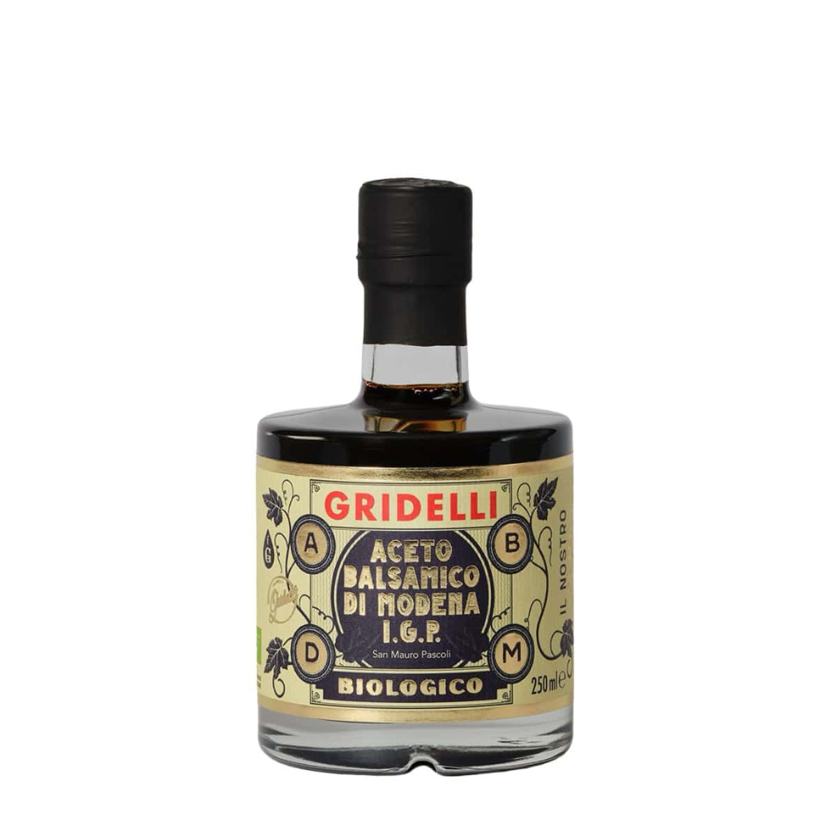 En klassiker från Modena – lika vacker som den är god.Gridellis Aceto Balsamico Nero är en ekologisk balsamvinäger I.G.P., lagrad i Modena på solmogna druvor från Emilia-Romagna. Helt fri från tillsatt socker, färgämnen och onödiga tillsatser – bara ren, fyllig smak med naturlig sötma från druvan.