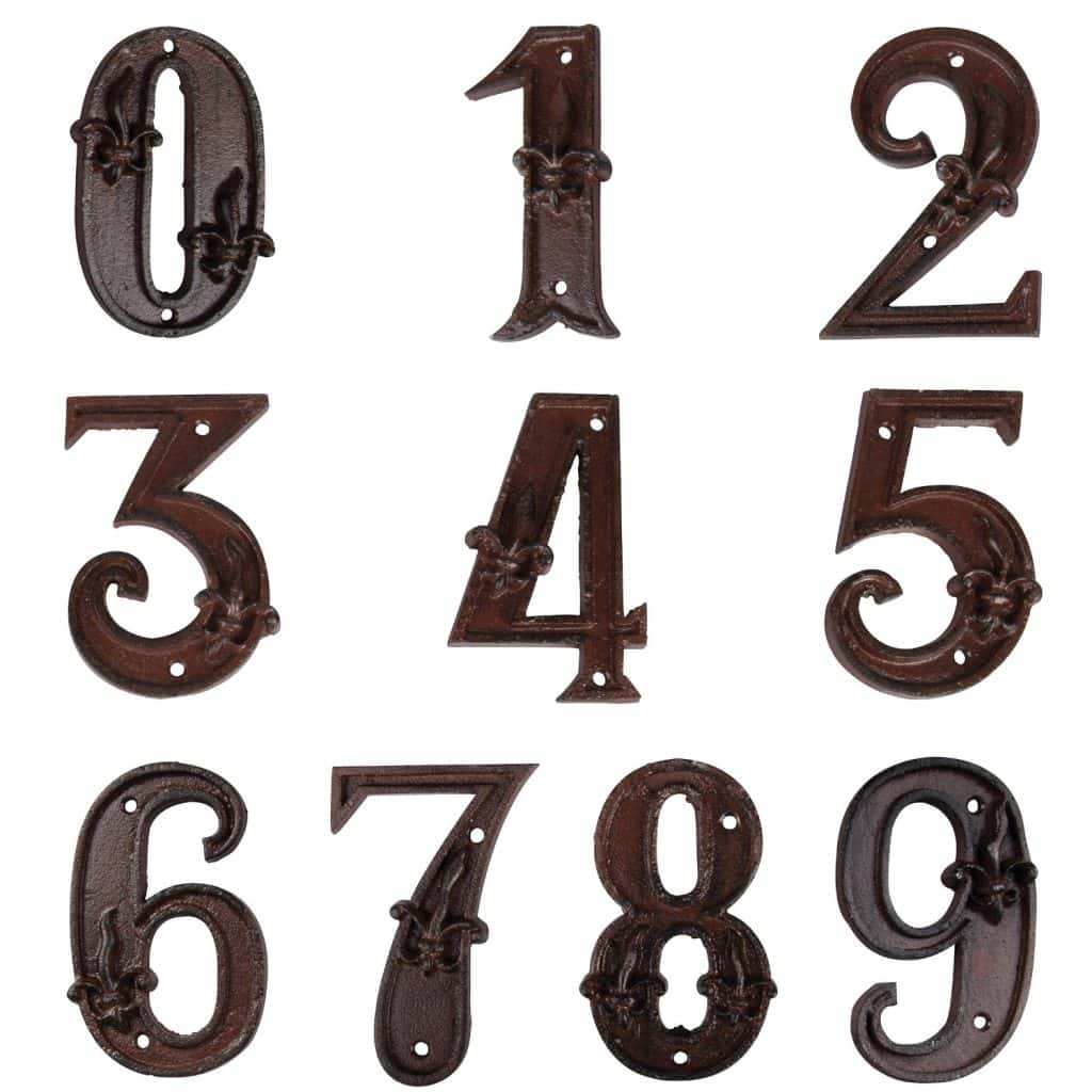 Husnummer från det nederländska varumärket Esschert Design. De dekorativa hussiffrorna är i gjutjärn och har en brun nyans. De ingår i samma serie som dessa husbokstäver, klicka här>>