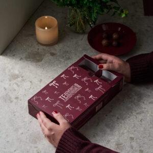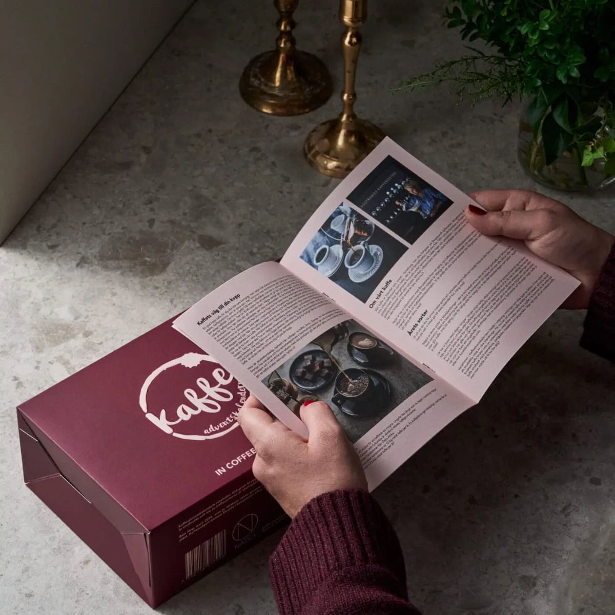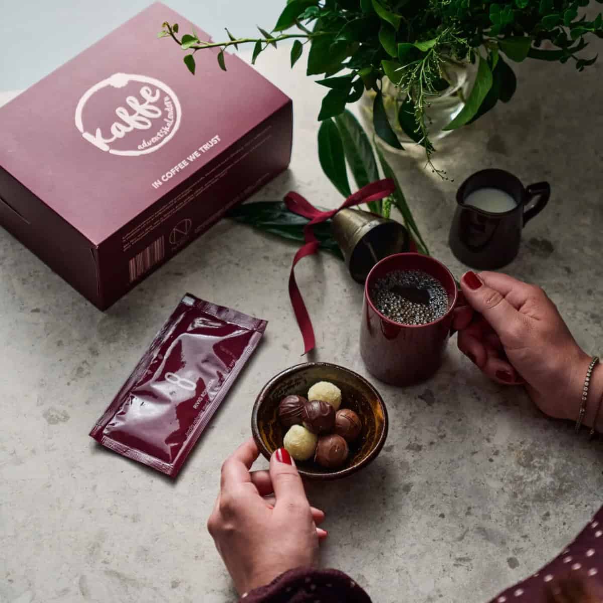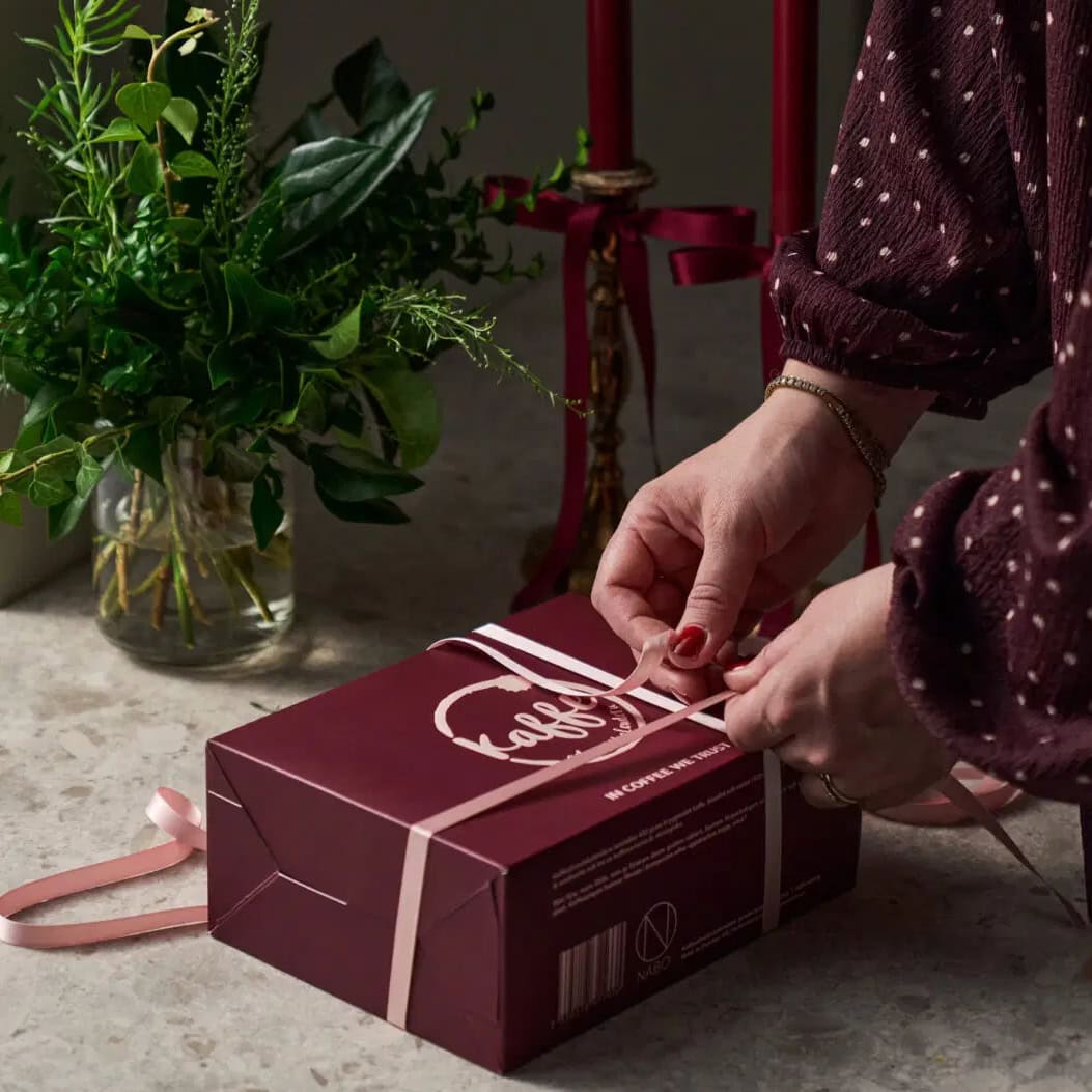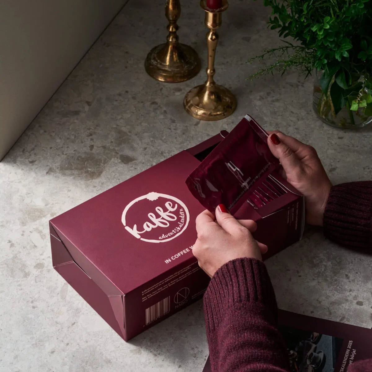 För många kaffeälskare har Nabos kaffeadventskalender blivit en tradition. Den är lika fin som gåva till någon man tycker om, som en egen vardagslyx i adventstid. Årets ask är djupt vinröd med en pudermatt präglad logga som ger en lyxig känsla.