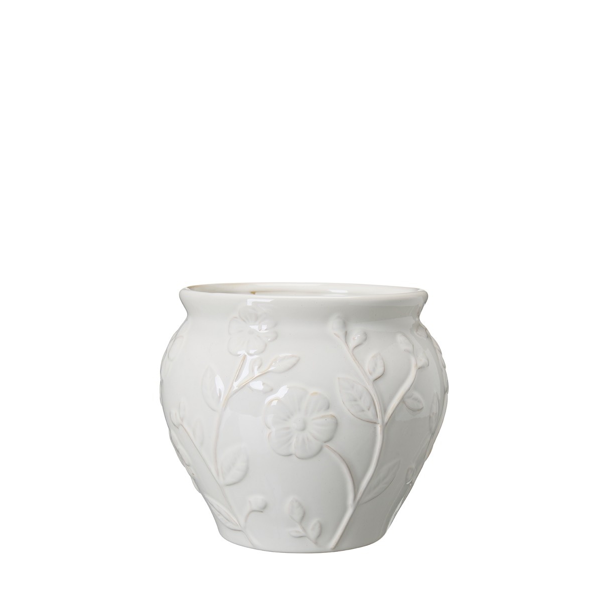 Vit porslinskruka med mjuk blomrelief. Eliza kruka ger ett lugnt, romantiskt uttryck och låter växterna stå i fokus.
