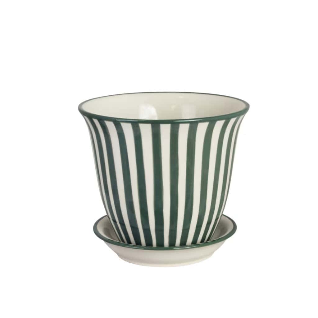 Handmålad kruka i mörkgrönt stengods med klassiska ränder. Med dräneringshål och fat – perfekt för enkel plantering.