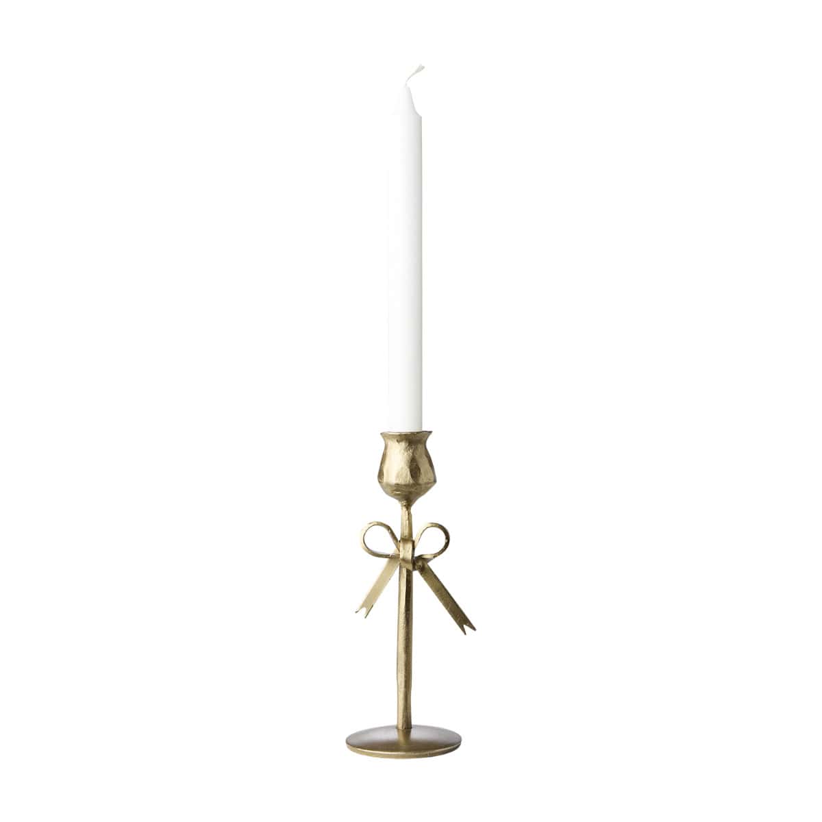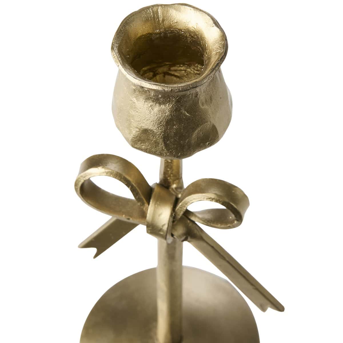 Handgjord ljusstake i mässingsfärgat järn med dekorativ rosett. En elegant liten detalj som sprider värme och skimmer på bordet eller i fönstret.