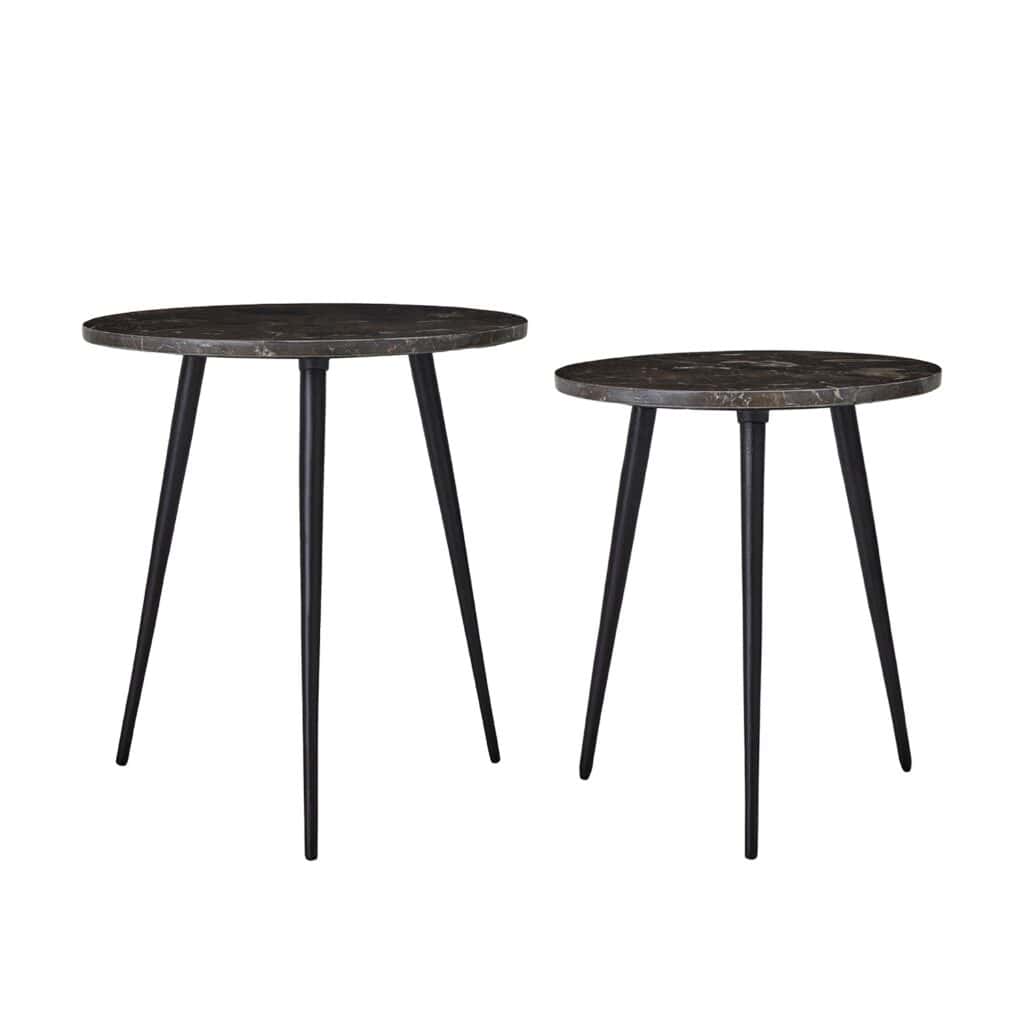 Sidobord KOBE från det svenska varumärket Wikholm form. Borden har underrede i svart järn samt bordsskiva i brunmelerad marmor.