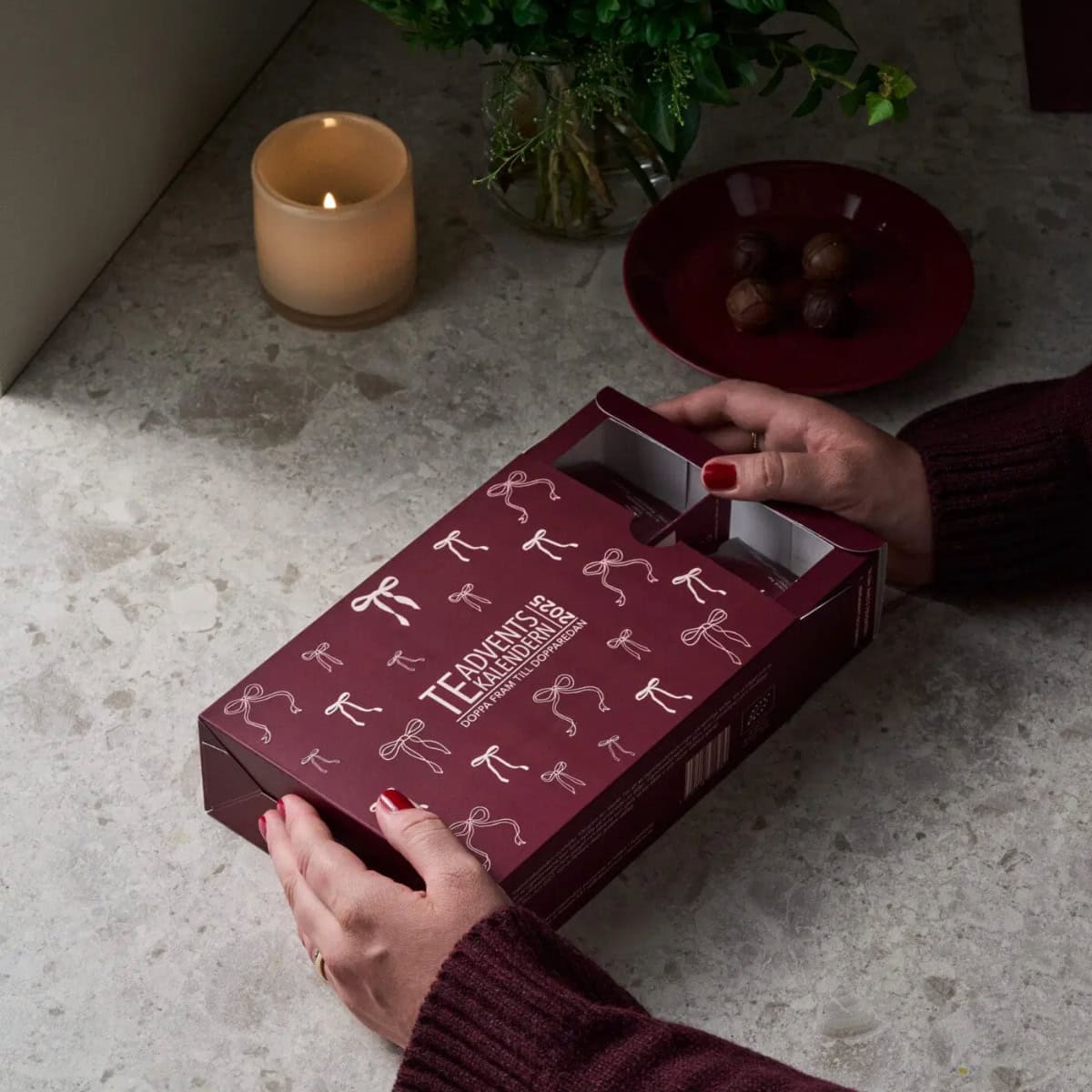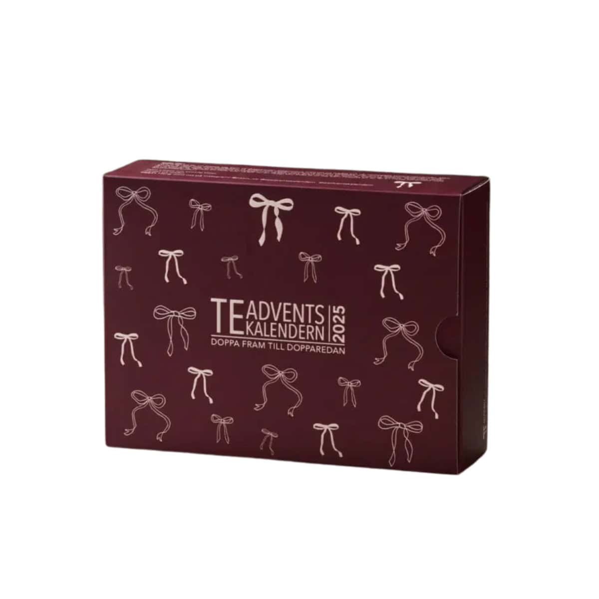En älskad jultradition i ny vinröd design med pudderrosa rosetter. Innehåller 24 ekologiska tesorter – en kopp ro och doft av jul varje dag fram till julafton. Alla teer är ekologiskt odlade, fria från gluten och mjölk.