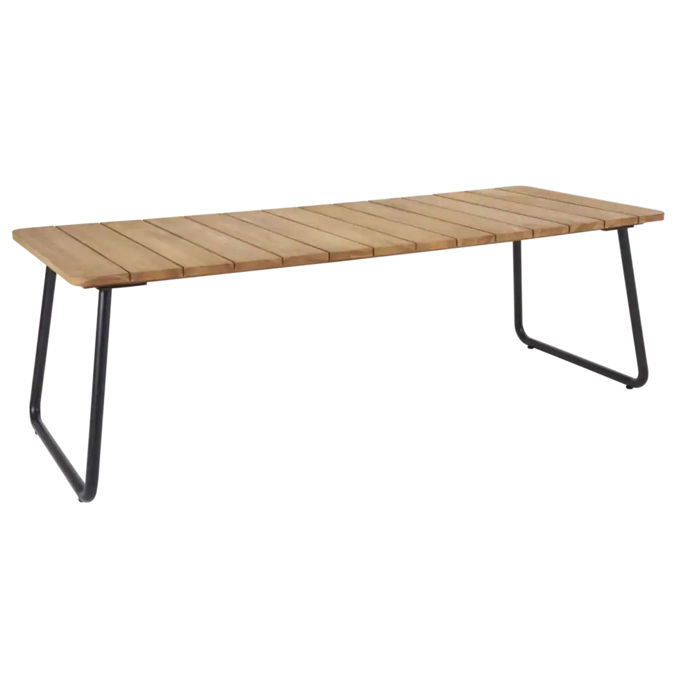 Stilrent trädgårdsbord i teak och svart aluminium. Med sin generösa storlek på 225x90 cm är det perfekt för middagar utomhus.
